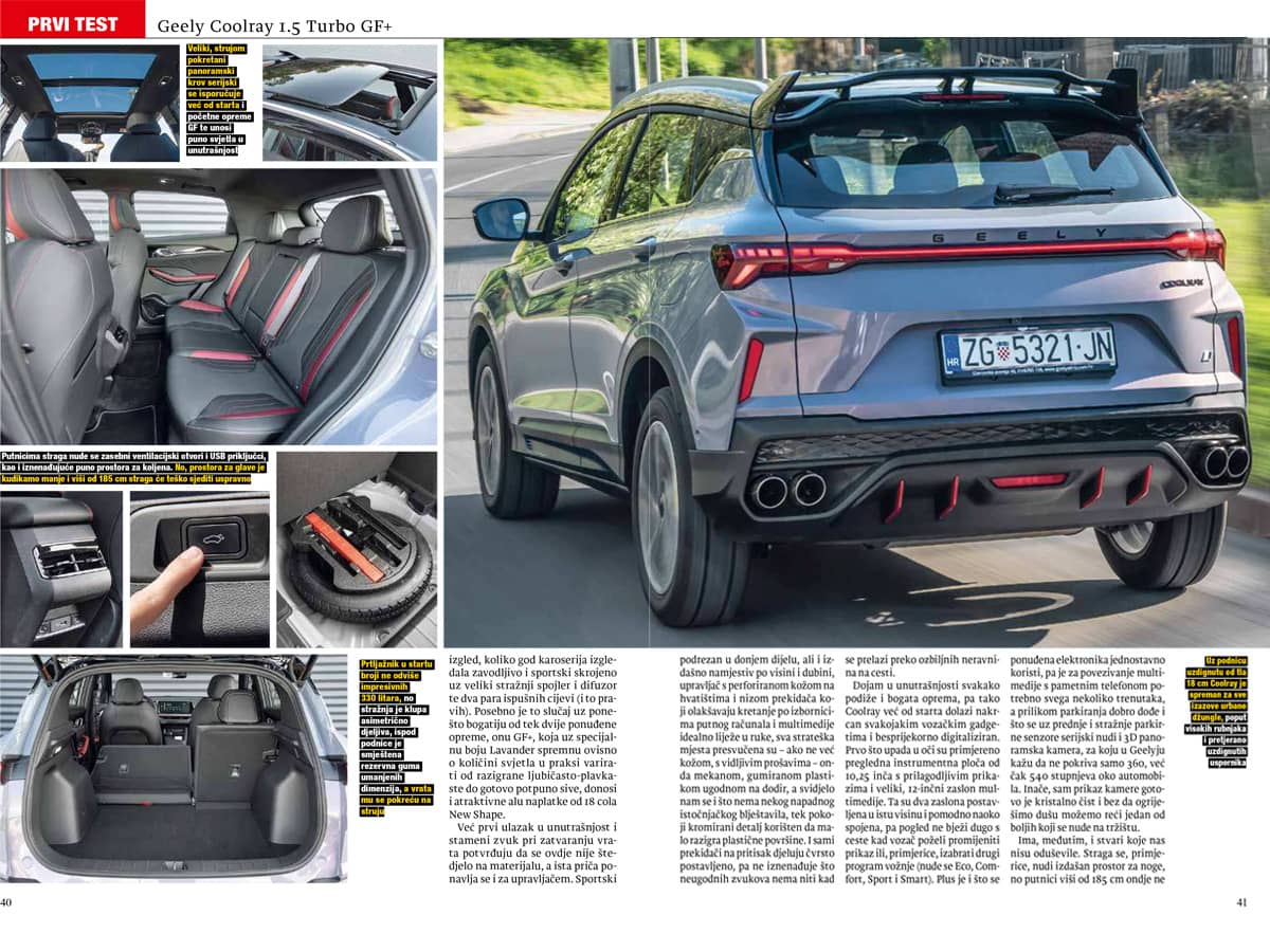 Šalu na stranu, Coolray se zbilja ima čime hvaliti, a jedan od aduta svakako mu je kvaliteta izrade. Ova, u međuvremenu čak dva puta redizajnirana izvedba (nakon posljednjeg, lanjskog redizajna kineski SUV je dobio novu, napadniju prednju masku i još poneki osvježeni detalj), ne polaže samo na izgled, koliko god karoserija izgledala zavodljivo i sportski skrojeno uz veliki stražnji spojler i difuzor te dva para ispušnih cijevi (i to pravih). Posebno je to slučaj uz ponešto bogatiju od tek dvije ponuđene opreme, onu GF+, koja uz specijalnu boju Lavander spremnu ovisno o količini svjetla u praksi varirati od razigrane ljubičasto-plavkaste do gotovo potpuno sive, donosi i atraktivne alu naplatke od 18 cola New Shape.
