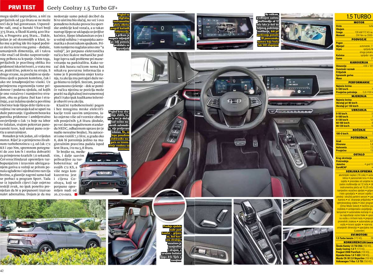 Ta su dva zaslona postavljena u istu visinu i pomodno naoko spojena, pa pogled ne bježi dugo s ceste kad vozač poželi promijeniti prikaz ili, primjerice, izabrati drugi program vožnje (nude se Eco, Comfort, Sport i Smart). Plus je i što se ponuđena elektronika jednostavno koristi, pa je za povezivanje multimedije s pametnim telefonom potrebno svega nekoliko trenutaka, a prilikom parkiranja dobro dođe i što se uz prednje i stražnje parkirne senzore serijski nudi i 3D panoramska kamera, za koju u Geelyju kažu da ne pokriva samo 360, već čak 540 stupnjeva oko automobila. Inače, sam prikaz kamere gotovo je kristalno čist i bez da ogriješimo dušu možemo reći jedan od boljih koji se nude na tržištu. Ima, međutim, i stvari koje nas nisu oduševile. Straga se, primjerice, nudi izdašan prostor za noge, no putnici viši od 185 cm ondje ne mogu sjediti uspravljeno, a niti za prtljažnik od 330 litara se ne može reći da je baš gorostasan. Usporedbe radi, onaj u Suzuki Vitari broji 375 litara, u Škodi Kamiq 400 litara, u Peugeotu 405 litara... Dakle, jedan je od skromnijih u klasi, iako mu u prilog ide što ispod podnice skriva rezervnu gumu – doduše, umanjenih dimenzija, ali i takva više znači od široko rasprostranjenog pribora za krpanje. Osim toga, prtljažnik je pravilnog oblika što pridonosi iskoristivosti, a vrata mu se, praktično, pokreću na struju. S druge strane, na prednjim se sjedalima sjedi u punom komforu, čak i ako ste iznadprosječno visoki. Uz primjerenu ergonomiju tome pridonose i podatna sjedala, od kojih je ono vozačevo i namjestivo strujom, oba su grijana (baš kao i stražnja), a uz izdašnu sjedeću površinu i bočnice koje lijepo drže tijelo u zavojima i ne umaraju kad se uputi na duže putovanje. Ugodnom boravku putnika pridonose i ambijentalno osvjetljenje s čak 72 boje na izbor te izdašan, stujom pokretan panoramski krov, koji unosi puno svjetla u unutrašnjost.